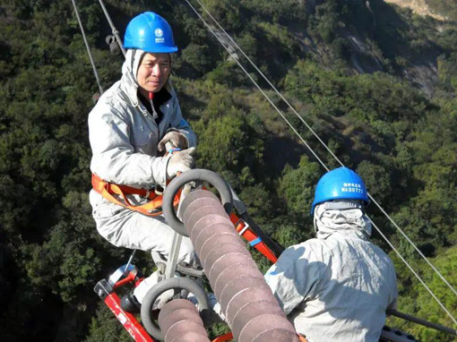 帶電作業員工使用出線飛車修補電力導線