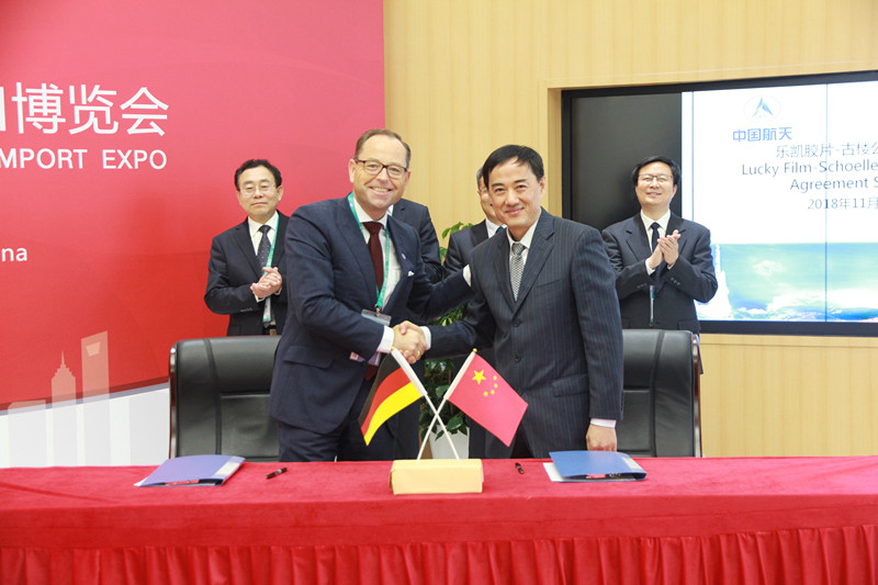 11月6日,在首屆中國國際進口博覽會上,航天科技集團所屬中國樂凱與世界相紙行業的佼佼者德國古樓紙業公司簽署了一份為期3年、總金額約8億元人民幣的供貨協議。