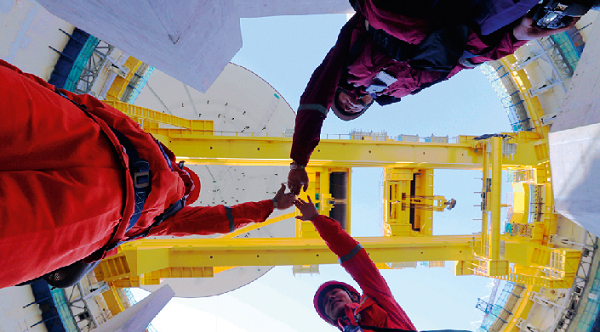 2018年3月,我國自主知識產權的第三代核電“華龍一號”示范工程第二臺機組進行穹頂吊裝。在穹頂起吊那一刻,參與吊裝的工程師們留下了這張合影,然后奔赴各自的工作崗位。世界核電迎來了“中國芯”時代,為茁壯成長的“華龍一號”喝彩。