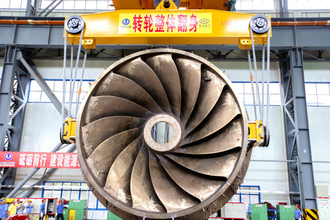 東方電氣研制的白鶴灘首臺機組轉輪整體翻身。