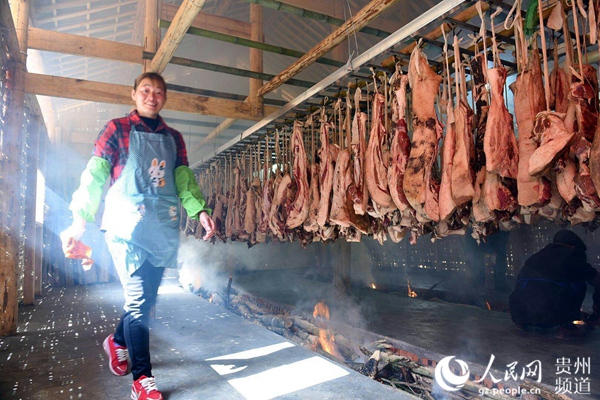 扶貧烘房里正在熏制的臘肉。趙曌 攝