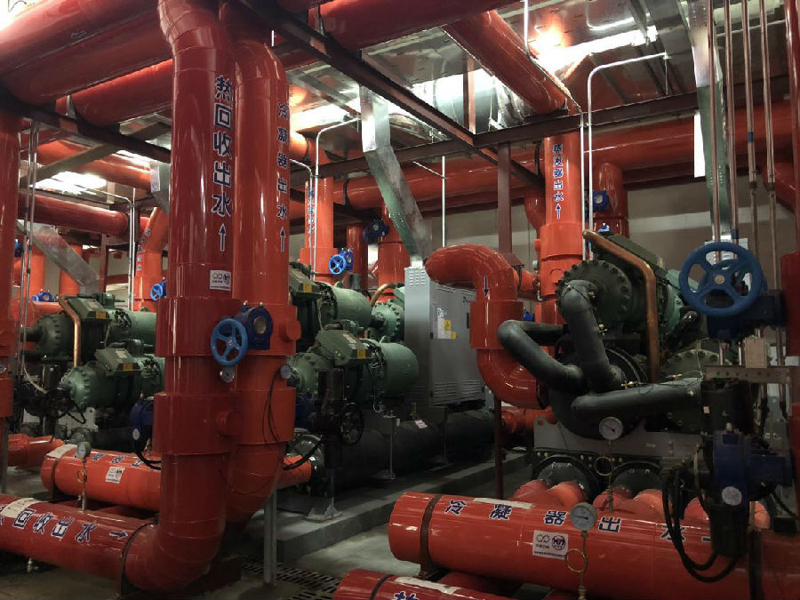 能源供應系統結合當地實際特點,遵循“成熟技術+系統創新”的設計理念,有效實現了安全、綠色、清潔、高效的供能目標。一是根據土壤冬暖夏涼的特點,通過1510根、深120米、總長超過25000米的地埋管,從土壤中提取淺層地溫能,為整個園區提供70%-75%的供能來源;二是根據生活污水冬夏兩季與環境溫度差大的特點,從園區每天產生的生活污水中提取能量,作為輔助供能來源;三是根據河北地區晝夜峰谷電價差大的特點,通過設置1500立方米的蓄能水池進行儲能調節,夜間蓄能、白天釋能,進一步降低電費支出;四是在夏季通過回收空調循環水中的熱量,變廢為寶,為整個園區免費制備生活熱水。