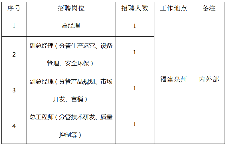 為深入貫徹落實(shí)黨中央全面深化國(guó)企改革重大決策部署和集團(tuán)公司深化生產(chǎn)經(jīng)營(yíng)管理組織模式改革要求,切實(shí)推進(jìn)公司科改示范行動(dòng)向縱深發(fā)展,根據(jù)業(yè)務(wù)發(fā)展需要,現(xiàn)對(duì)中化學(xué)天辰(泉州)新材料有限公司開(kāi)展市場(chǎng)化選聘職業(yè)經(jīng)理人,具體情況如下: