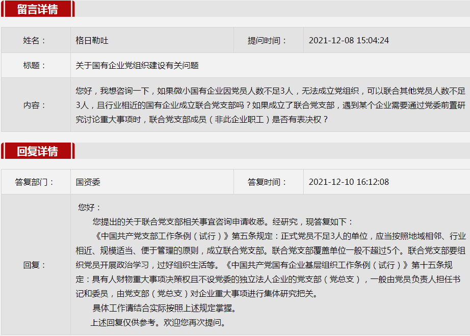 2021年12月國(guó)資委網(wǎng)站政務(wù)咨詢(xún)欄目部分網(wǎng)友提出的咨詢(xún),我們初步做出了認(rèn)真的回應(yīng),現(xiàn)選擇五條關(guān)注度高、點(diǎn)擊量高的問(wèn)題,再次推薦分享。