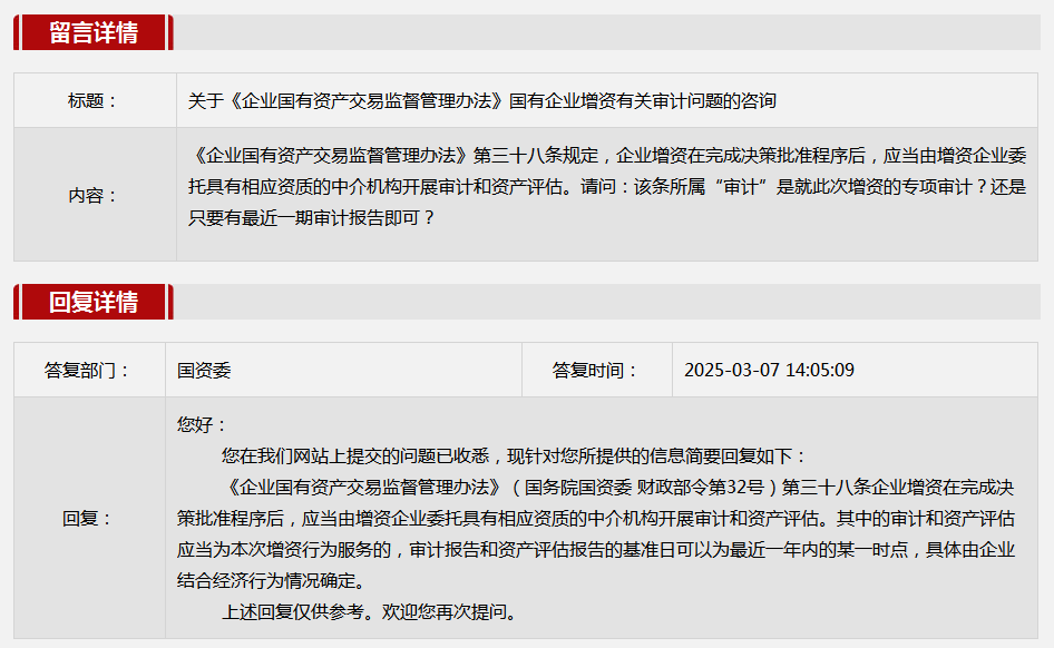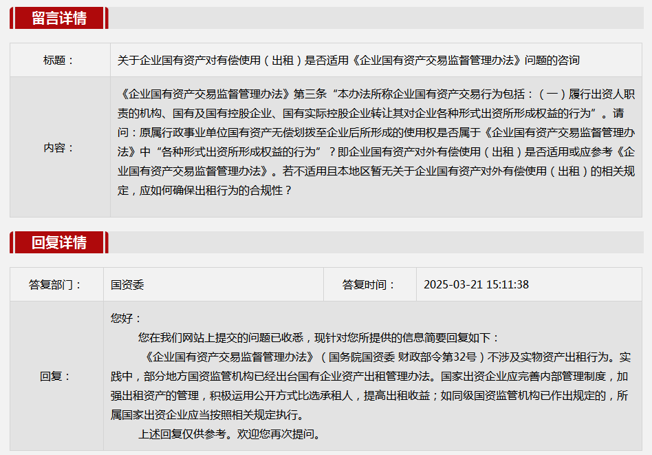 2025年3月國務(wù)院國資委網(wǎng)站政務(wù)咨詢欄目部分網(wǎng)友提出的咨詢,我們初步做出了認(rèn)真的回應(yīng),現(xiàn)選擇五條關(guān)注度高、點(diǎn)擊量高的問題,再次推薦分享。