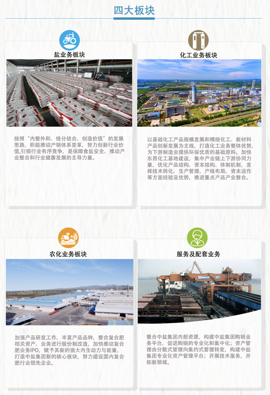中國鹽業集團有限公司(原中國鹽業總公司,以下簡稱中鹽集團)創立于1950年,現為國務院國資委監管的國有大型企業,是我國鹽行業的龍頭企業、唯一的中央企業和唯一全國性企業,是世界第二、亞洲最大的鹽業企業和國內重要化工企業。中鹽集團現擁有全資、控股子公司43家,職工近2.6萬人。作為全國食鹽生產經營主體,中鹽集團一直致力于確保國家合格碘鹽供應;在鹽化工方面,中鹽集團已初步形成了無機化工、農業化工、精細化工、日用化工等系列產業布局,部分產品進入世界和全國前列。