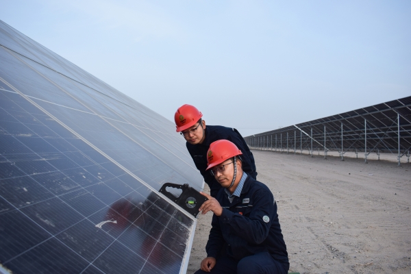 中國(guó)綠發(fā)建設(shè)先鋒隊(duì)進(jìn)行光伏板安裝質(zhì)量檢查