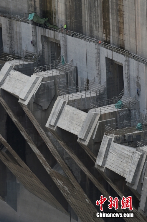 白鶴灘水電站是世界首次全壩使用低熱水泥混凝土進行建設,建成“無縫大壩”,打破了“無壩不裂”的魔咒。圖為白鶴灘水電站工人在壩上工作。