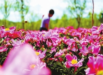 農民在河北省承德縣三溝鎮三溝村藥用芍藥基地里除草。(新華社發)